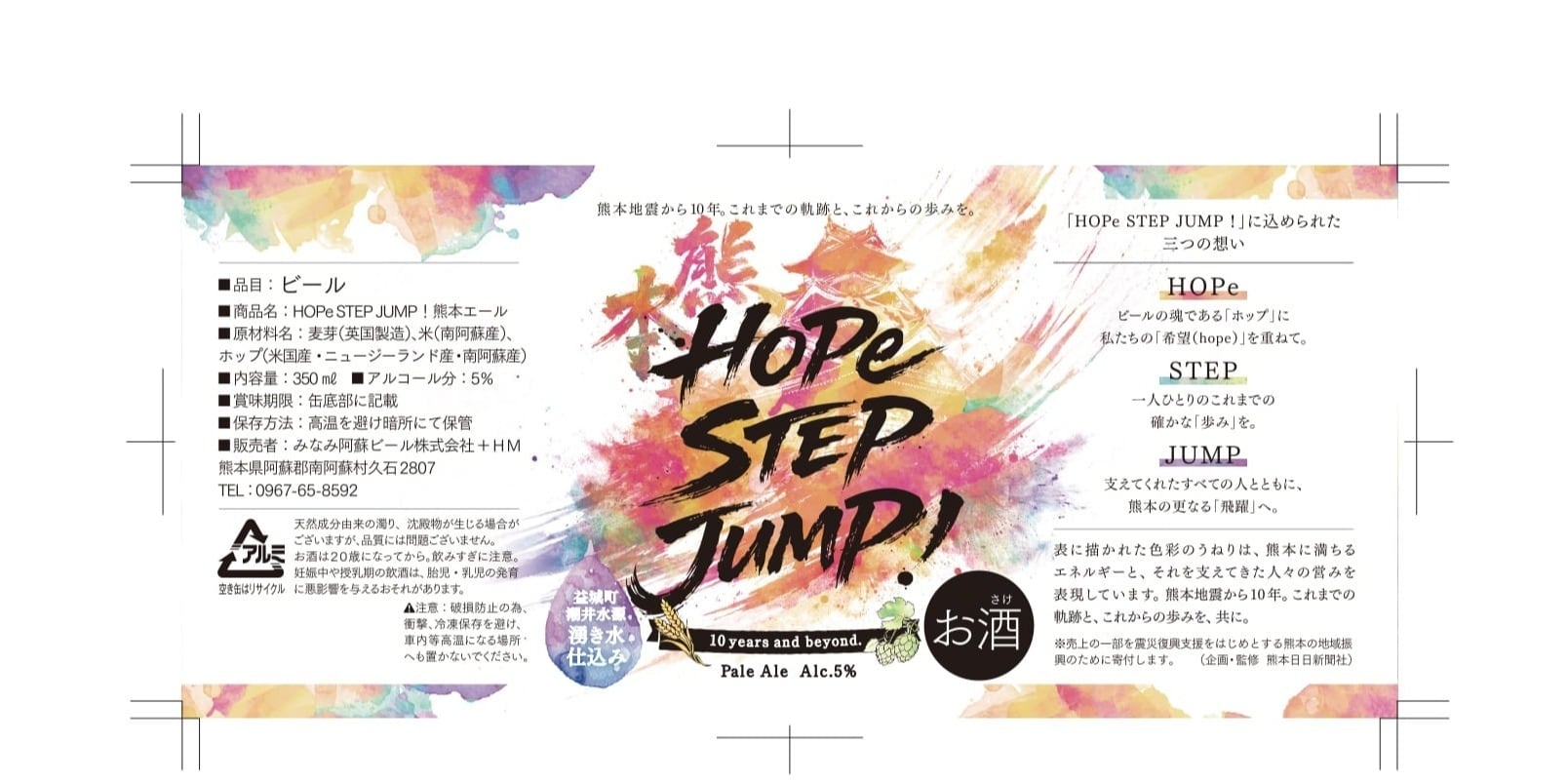熊本地震で被害を受けた南阿蘇村、益城町の素材を原料に、震災復興10年を祈念して醸造したクラフトビール。仕込み水には益城町の潮井水源の湧水、主原料の一部に南阿蘇村の米、ホップを使用したフルーティな味わいが特徴のペールエール。モルティな味わいは復興の力強さ、ホップの華やかな香りは復興の歓びを表現。